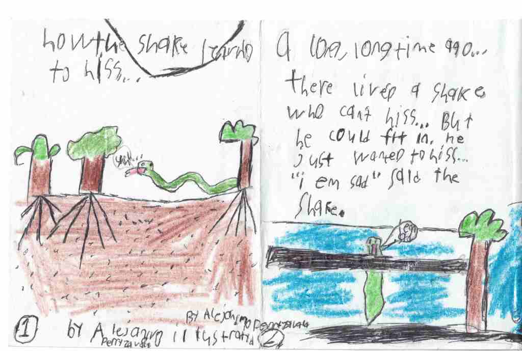 [2: A long, long time ago… there lived a snake who can’t hiss. But he could fit in. He just wanted to hiss. “I am sad,” said the snake.]